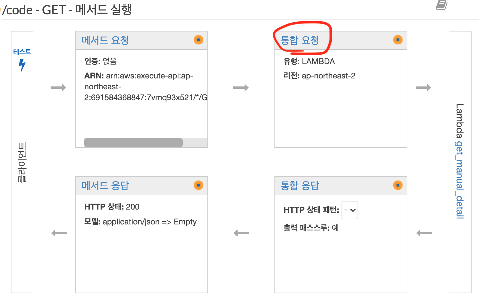 API Gateway에 리소스와 GET 메서드를 생성해주고 앞서 생성한 람다함수를 연결했습니다.