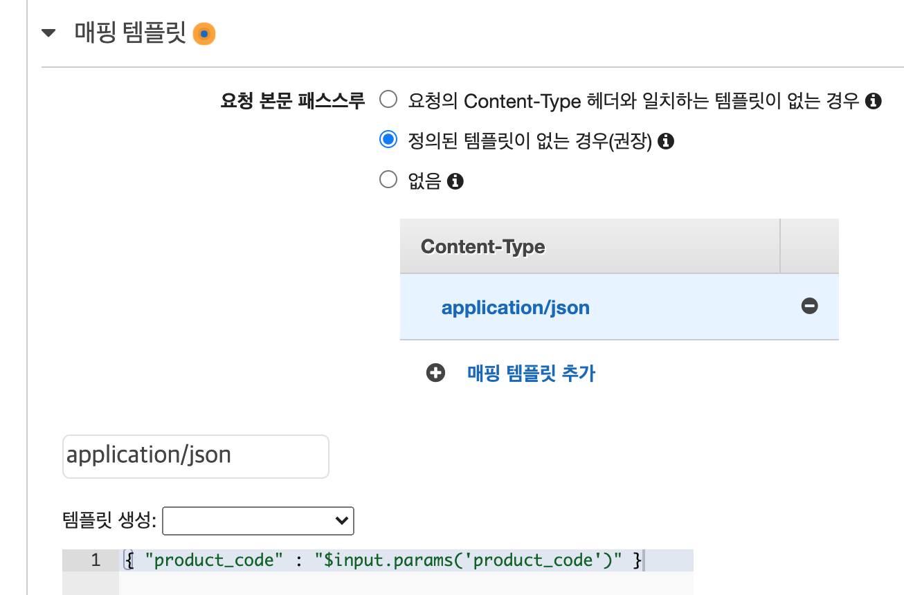 통합 요청 -> 매핑 템플릿 -> 정의된 템플릿이 없는 경우 -> application/json -> 매핑룰 작성