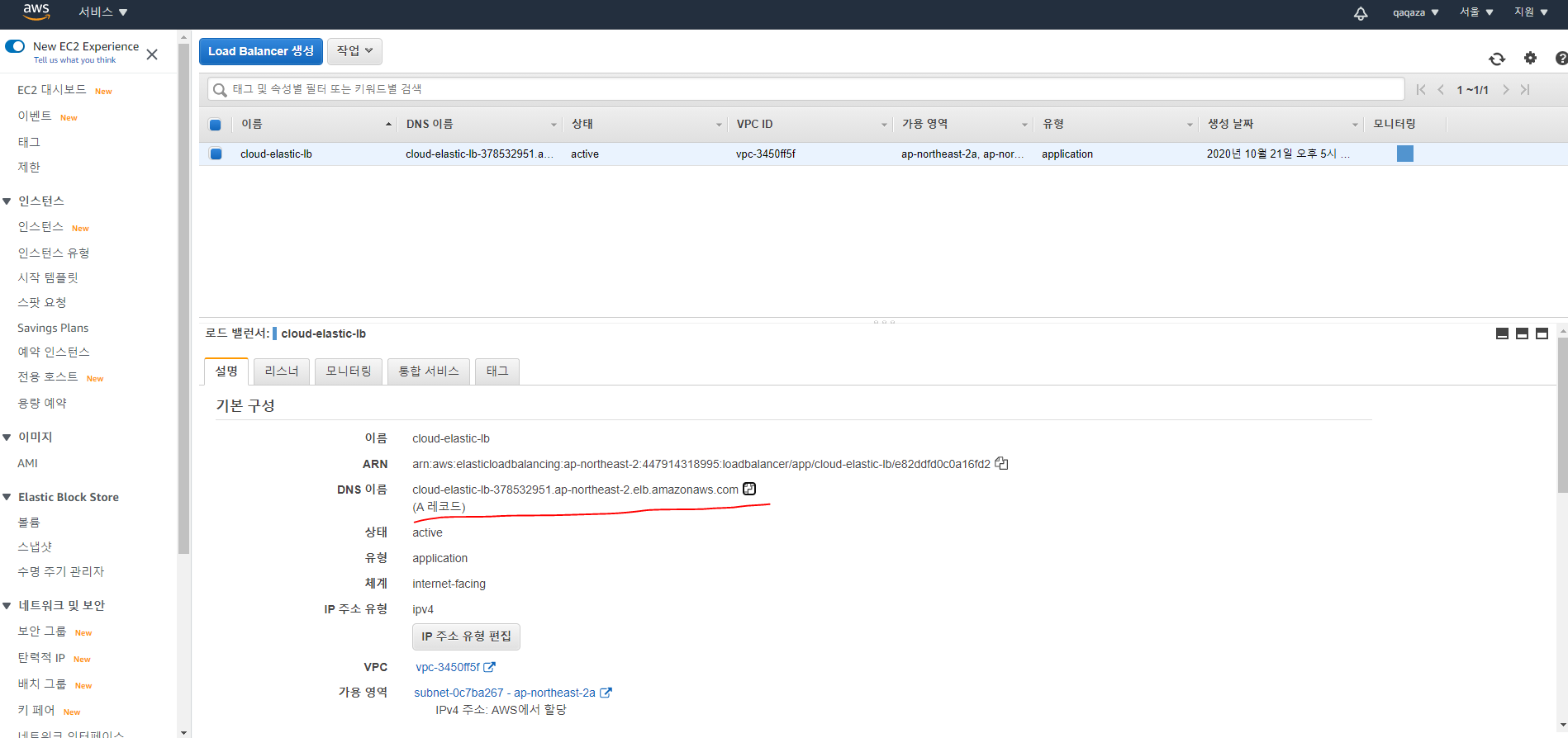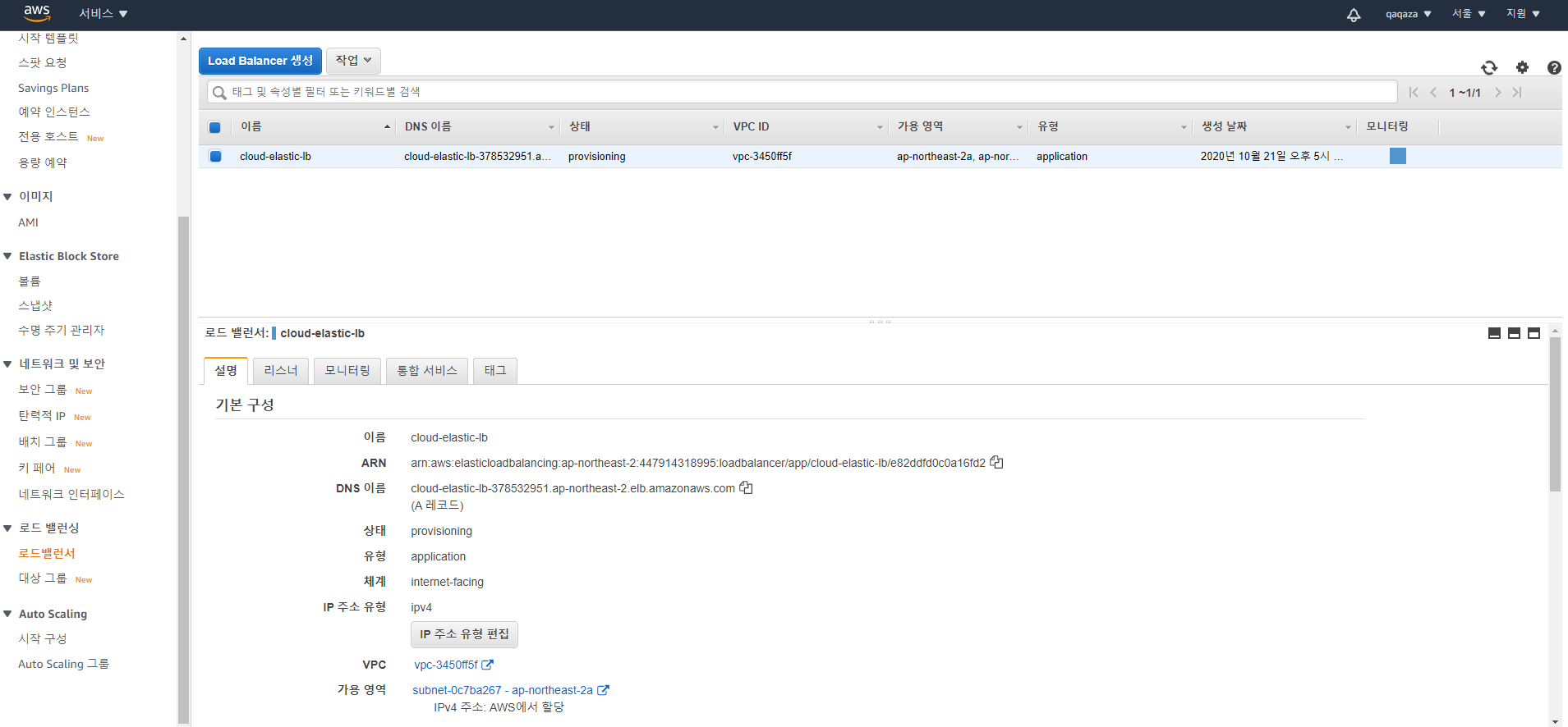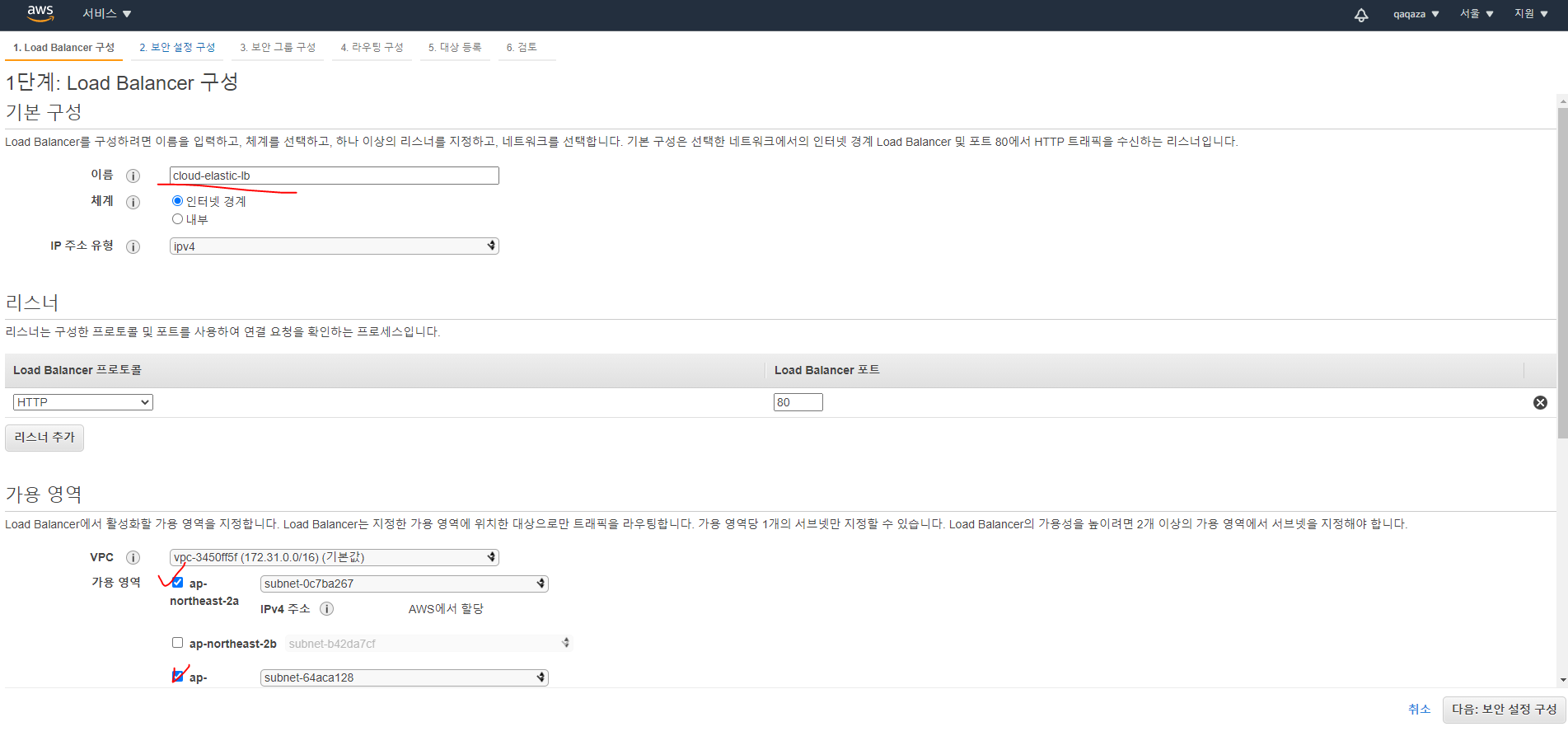 cloud-elastic-lb라는 이름과 가용 영역을 저희가 앞서 오토스케일링 그룹에서 설정했던 대로 맞추어 줍니다.