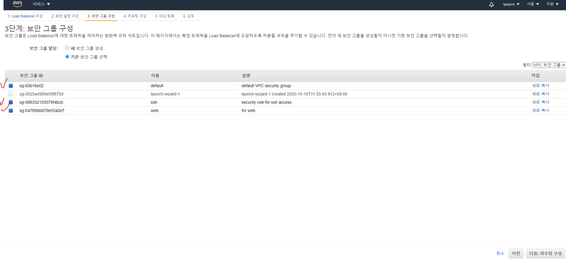 보안그룹에서 VPC 기본 보안 그룹과 HTTP, SSH 를 허용해줍니다.