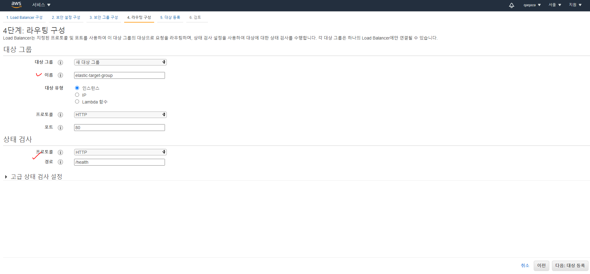 라우팅 구성에서는 로드밸런싱이 될 대상그룹의 이름과 상태 검사를 위한 경로를 입력해줍니다. 아래와 같이 elastic-target-group과 경로는 /health로 주었습니다. /health는 1부 포스팅의 app.js에서 URL 경로를 설정해두었기에 사용가능합니다.