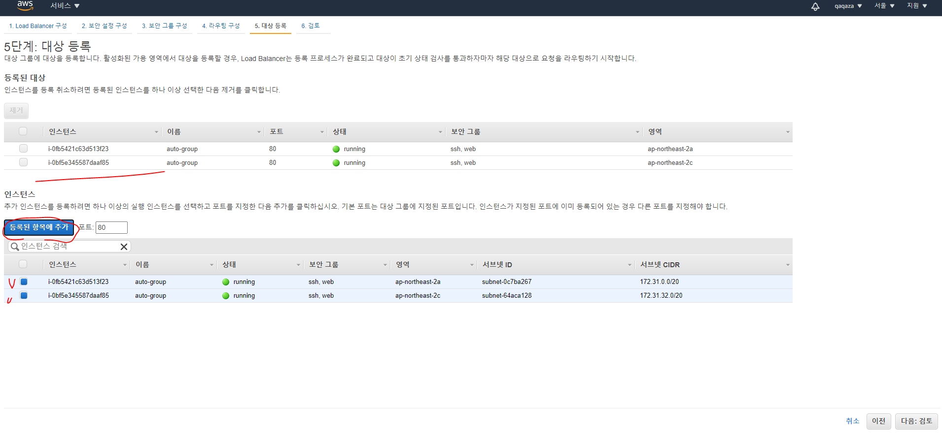 대상 그룹에 오토스케일링으로 생성된 인스턴스들을 추가해줍니다. 인스턴스 체크 후 등록된 항목에 추가 버튼을 눌러주세요