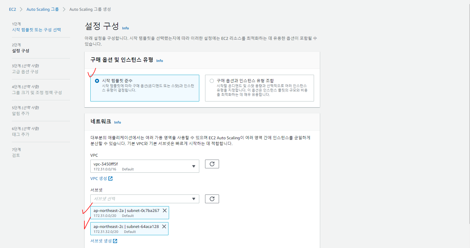 설정 구성에서는 네트워크 부분의 서브넷만 설정해줍니다. 저는 가용영역 ap-northeast-2a 와 ap-northeast-2c 안의 서브넷을 선택 해주었습니다. 이 서브넷에 자동으로 ec2 인스턴스가 생성됩니다.