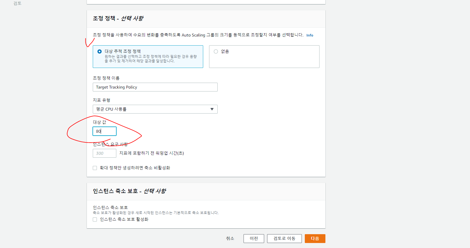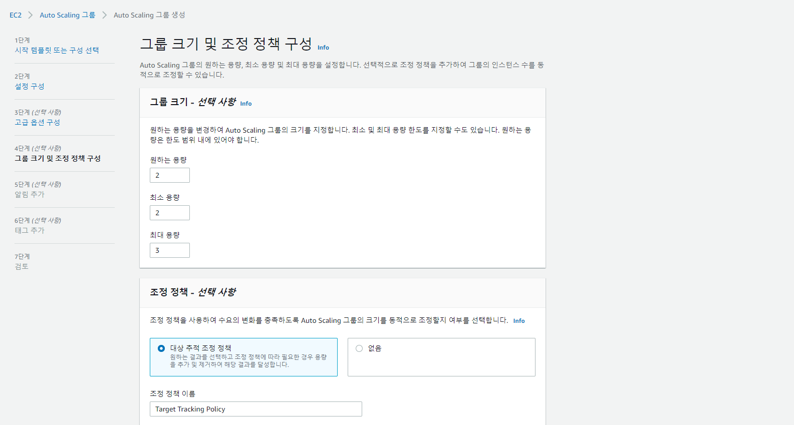 그룹 크기 및 조정 정책에서는 원하는 용량 , 최소 용량, 최대 용량을 각각 2, 2, 3으로 설정해줍니다. 이 부분이 인스턴스 개수를 설정하는 부분입니다. 그 다음, 조정 정책에서 “대상 추적 조정 정책”에서 “지표 유형”의 평균 CPU 사용률 대상 값을 80으로 설정해줍니다. 이는, 만약 2개의 인스턴스가 가동되는 있는 상황에서 1개의 인스턴스 사용률이 80%가 넘어가면 새로운 인스턴스를 생성합니다.