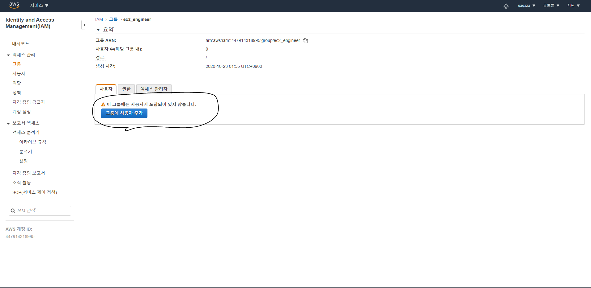 - 그룹을 생성한 뒤, 그룹 이름을 클릭하여 그룹에 위에서 생성한 IAM 사용자를 추가합니다.