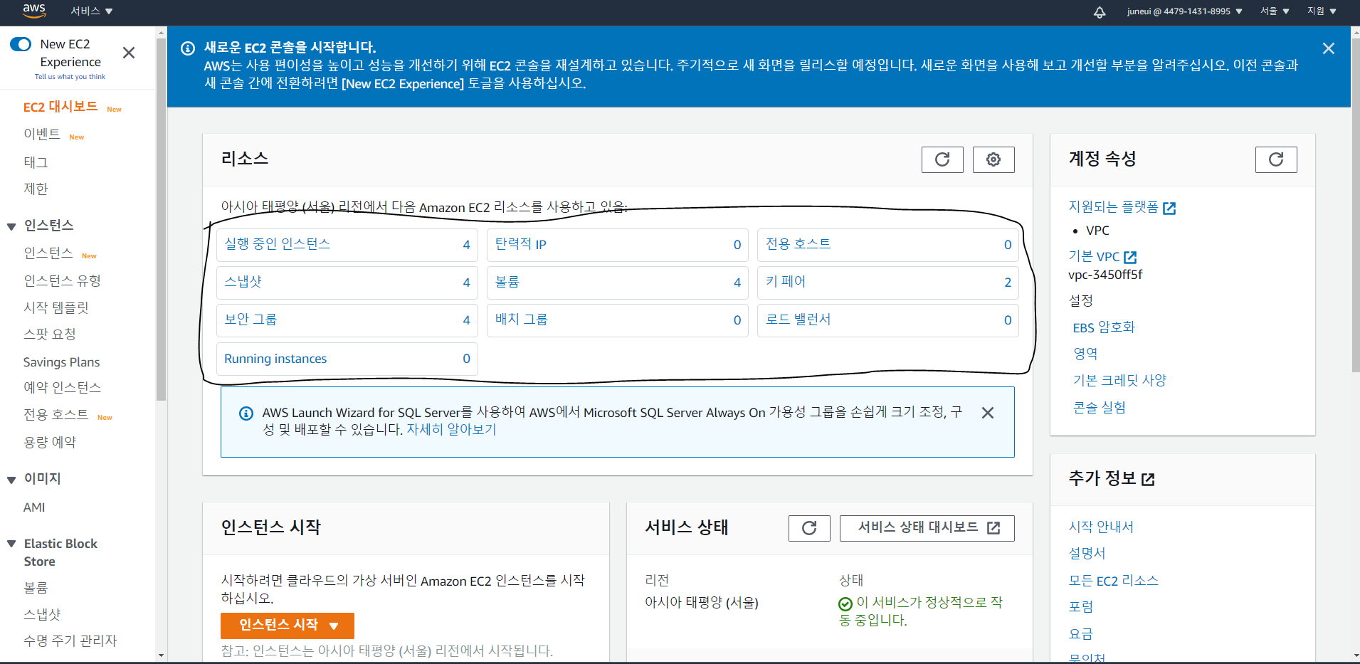 - 그런 다음, IAM 사용자 로그인 페이지(https://계정ID.signin.aws.amazon.com/console)로 접속하여 IAM 사용자로 로그인한 뒤 EC2 서비스로 이동하면 아까와는 다르게 인스턴스 상태를 볼 수 있습니다.
