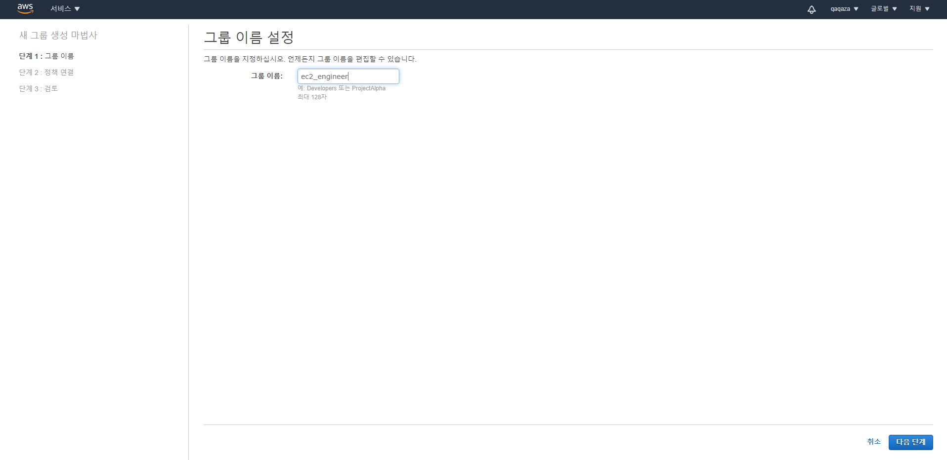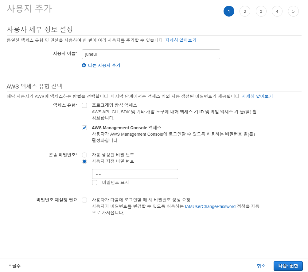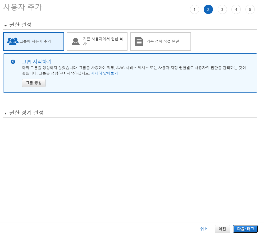 - 그룹은 바로 다음에 설명하겠지만, 여러 사용자들이 속해있는 형태가 그룹입니다. 그 밖에 복사, 직접 정책 연결로 권한을 부여할 수 있습니다. 연습이라 아무 권한도 주지 않았습니다.