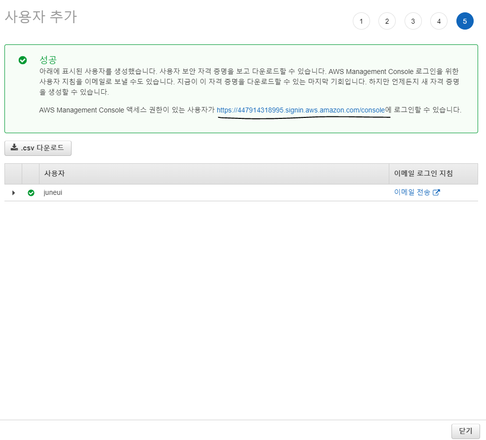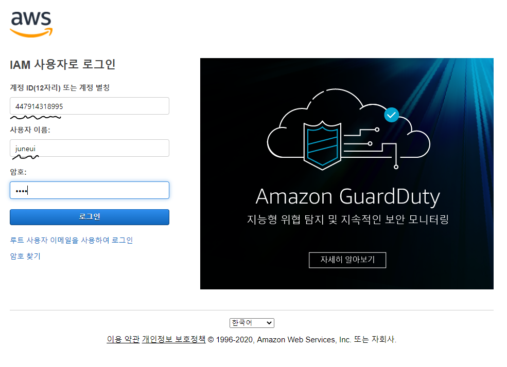 - https://계정ID.signin.aws.amazon.com/console 로 새로운 사용자는 로그인 할 수 있습니다. 주의할 점은 사용자 이름과 계정 ID(루트마다 AWS에서 부여)는 다르다는 점입니다.