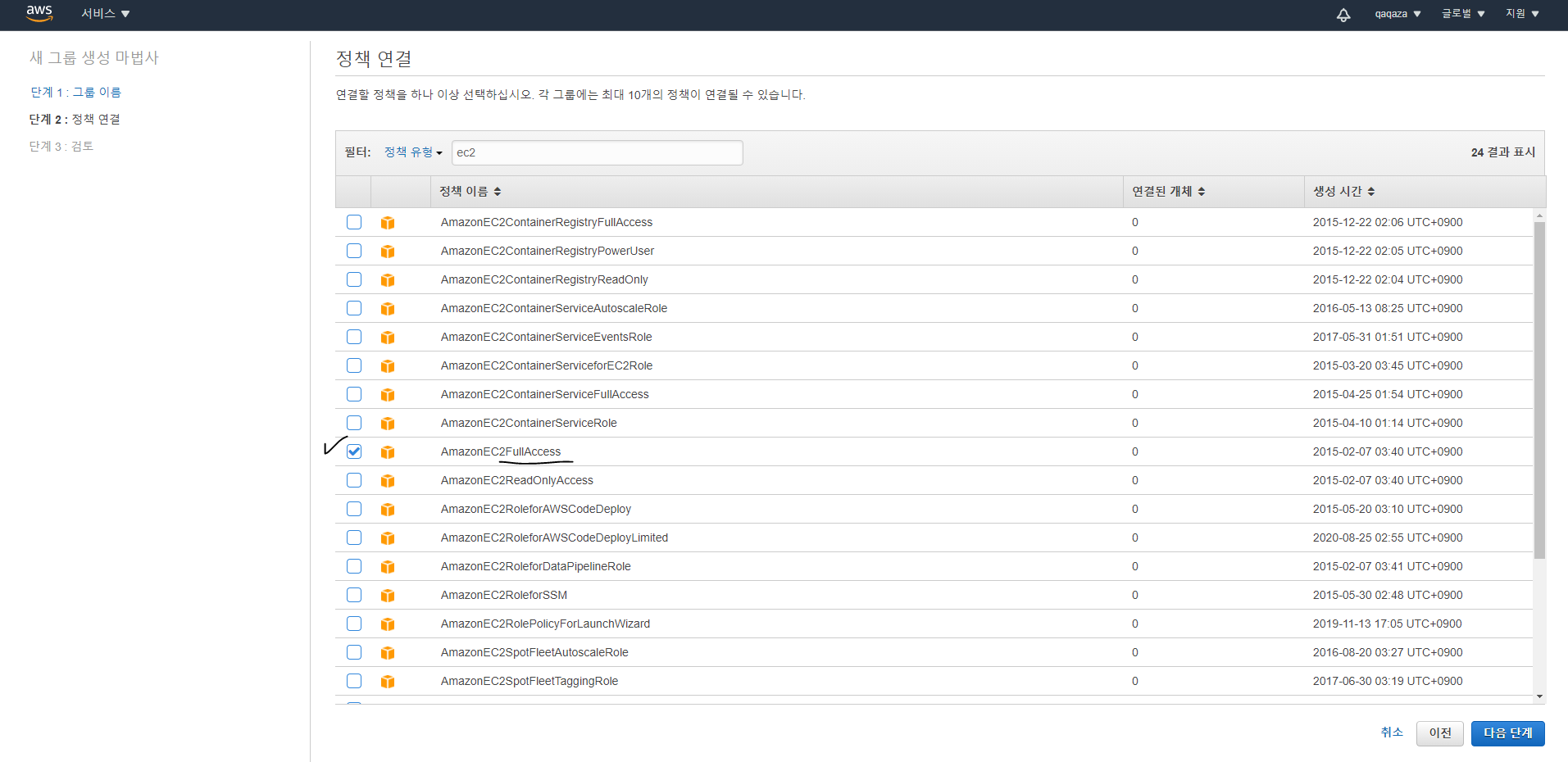 - 필터에 ec2를 검색한 뒤, AmazonEC2FullAccess를 체크후 다음단계를 클릭합니다.