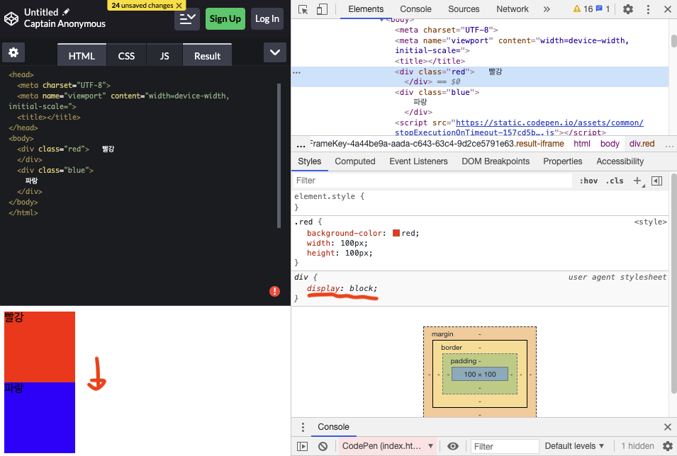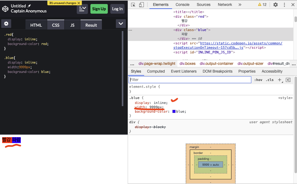 div 태그는 기본적으로 block을 타입으로 가지기 때문에 display: inline; 으로 변경했습니다. 그 후, 파랑색에 width을 주었지만 아무 변화가 없으므로, width 속성이 먹히지 않음을 알 수 있습니다. 반면, font-size 같은 속성을 적용됩니다.