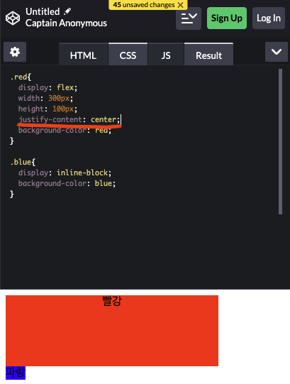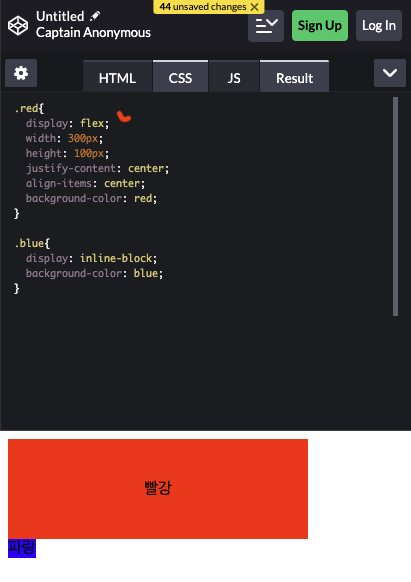 Align-items 는 main-axis의 수직 방향 축에 대응합니다. flex-direction을 row로 했다면 cross-axis는 세로축이 됩니다. 따라서 align-items: center; 를 하면 <div class="red">빨강</div> 의 “빨강” 자식요소가 div 태그의 정중앙에 배치됩니다.